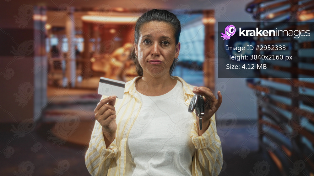 Woman holding creditcard and keys in airport lounge, shrugging with puzzled expression; uncertainty travel plans.