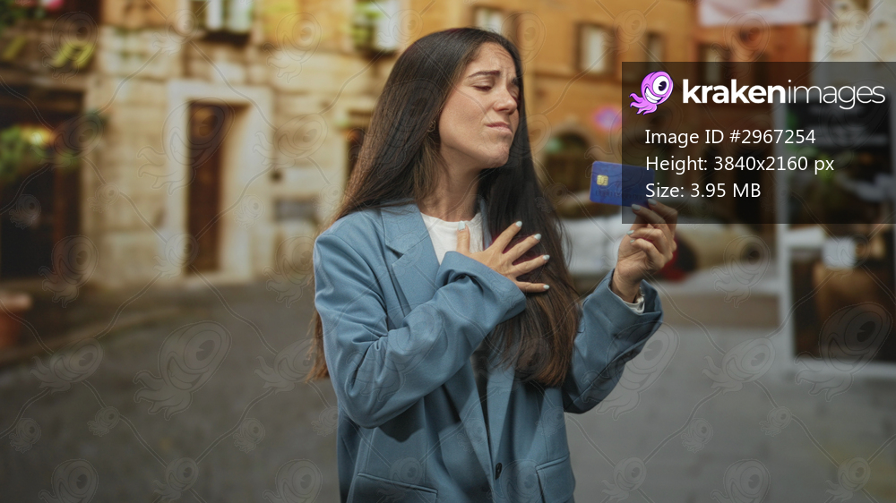 Woman holding creditcard near face, left hand pressed to chest, worried expression amid cobblestone street and old buildings; financial anxiety.