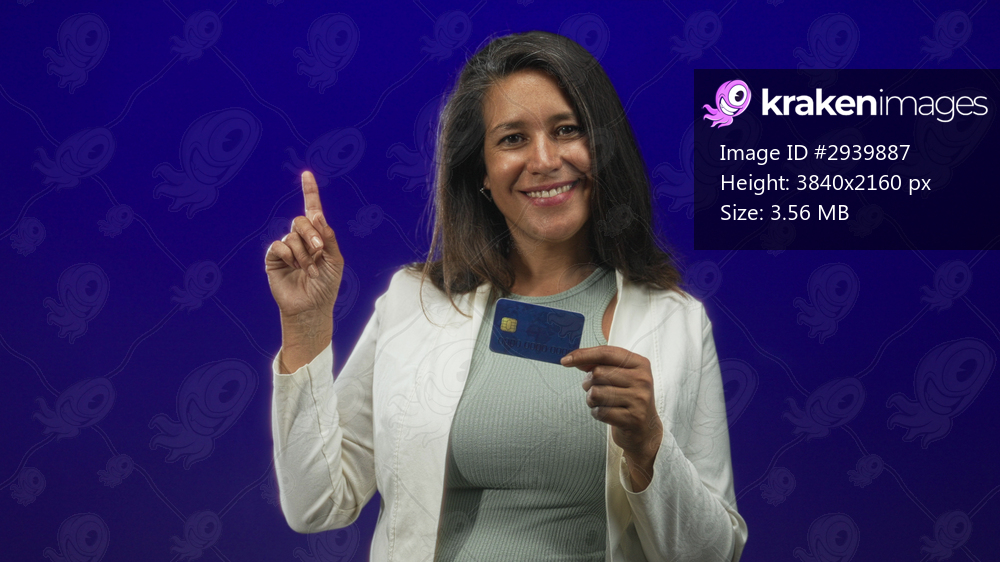 Woman holding creditcard and points index finger while smiling in studio; confidence financial empowerment.
