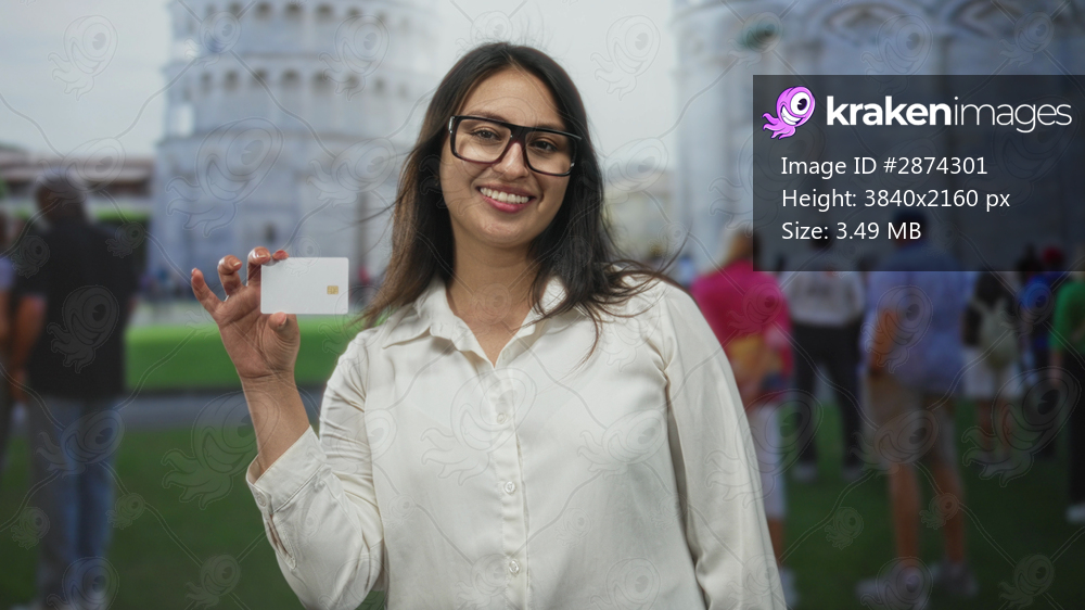 Woman holding creditcard with raised hand in front of the leaning tower of pisa building, smiling and showing the card; travel joy.