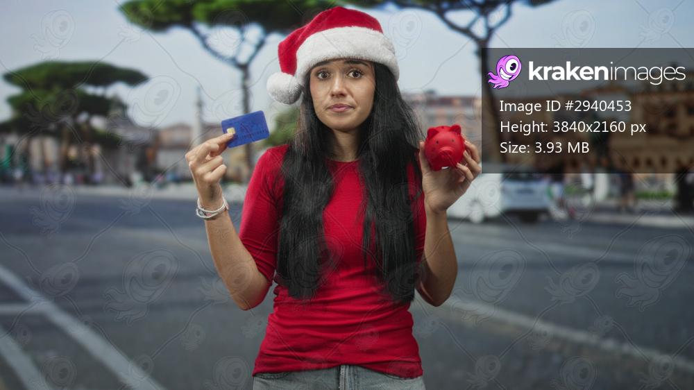 Woman holding creditcard and red piggybank, pinching card with fingers and shrugging shoulders in street; holiday money worry.