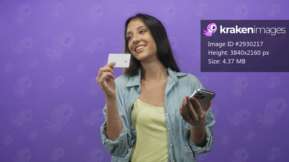 Woman holding creditcard and smartphone in studio with purple wall and casual denim shirt, smiling with eyes closed and relaxed posture; online shopping joy. - Kraken Images