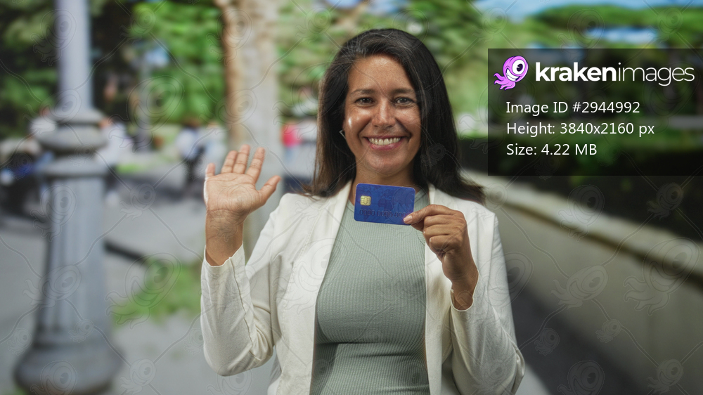 Woman holding creditcard and smiling, right hand raised in greeting on street beside lamppost and walkway; confidence convenience.