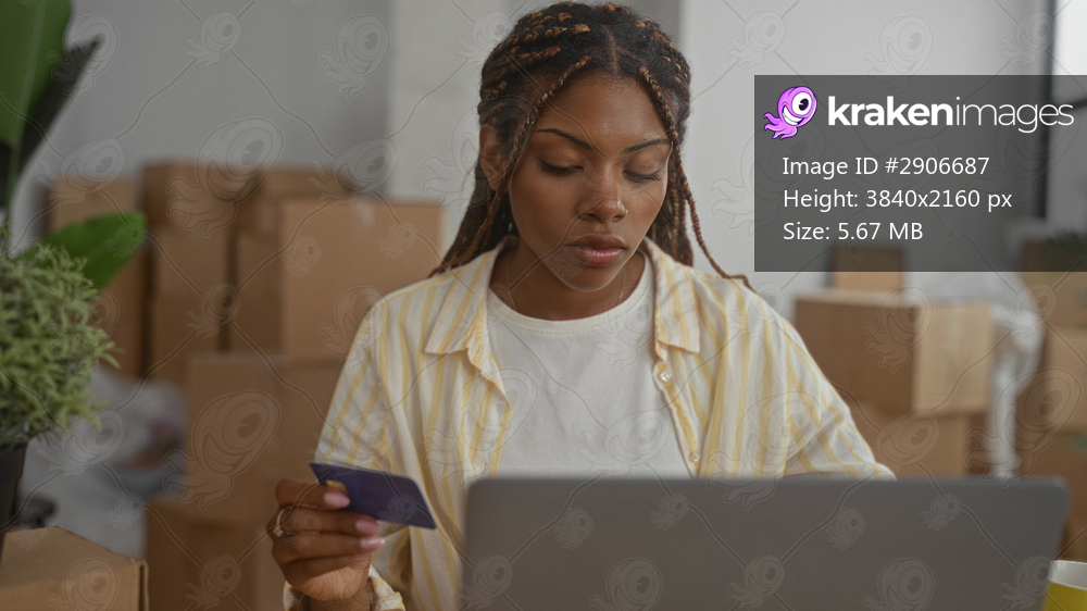 Woman holding creditcard and using laptop in building among stacked moving boxes and potted plant with braided hair and serious face; financial worry.