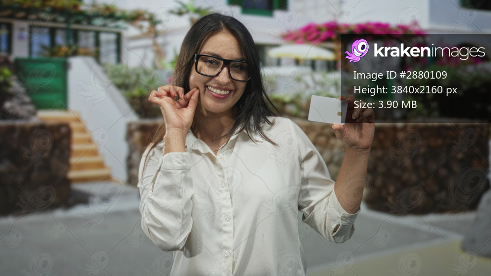 Woman holding creditcard with visible chip, finger to lips for silence, street scene with steps and planters; secrecy trust.