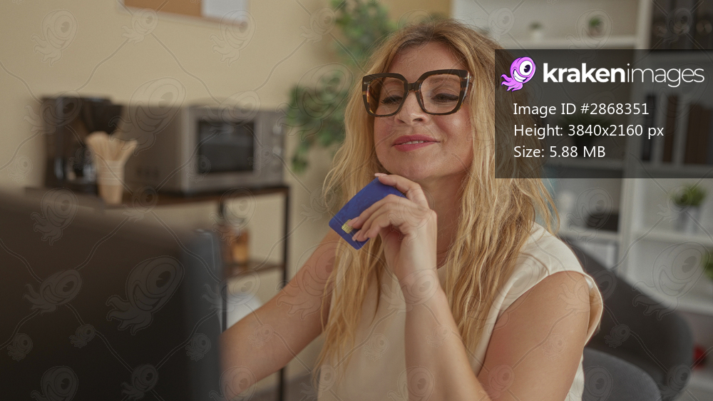 Woman holding creditcard while using computer at desk in office building; online payment trust focused.