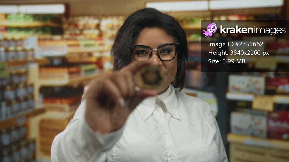 Woman holding cryptocurrency coin in a supermarket showcasing a plus-size, confident expression amid grocery aisles, highlighting modern financial trends indoors.