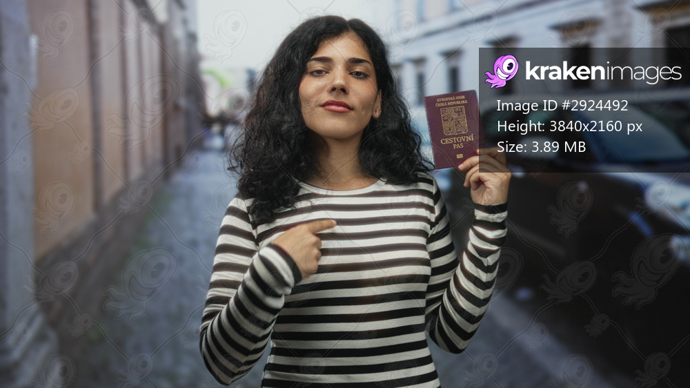 Woman holding czech passport in raised hand and points finger to chest on a cobblestone street with parked car and building facades; identity travel pride. - Kraken Images