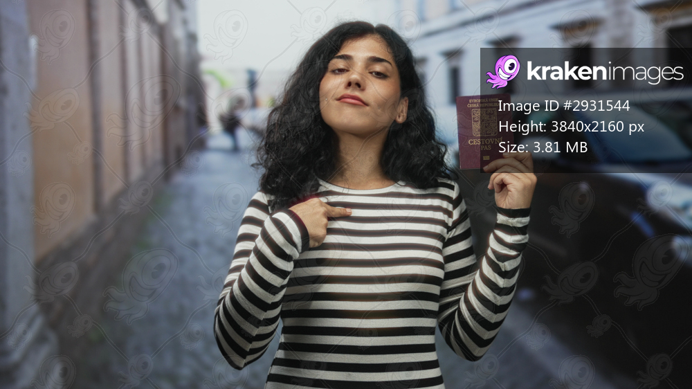 Woman holding czech passport in raised hand and points finger to chest on a cobblestone street with parked car and building facades; identity travel pride. - Kraken Images