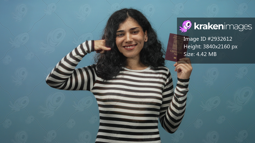Woman holding czech passport, making a phone gesture with one hand and presenting the passport with the other against a light blue studio backdrop; travel confidence. - Kraken Images