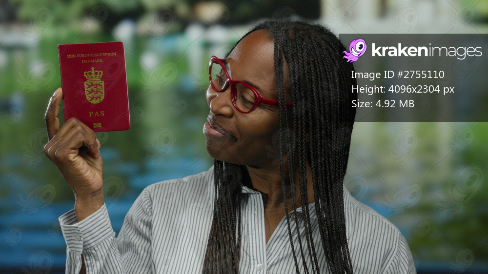 Woman holding danish passport smiles by outdoor lake setting, showcasing nationality and travel theme with vibrant energy.