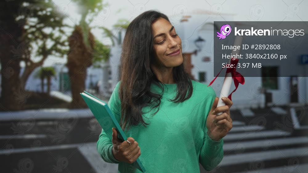 Woman holding diploma with red ribbon and teal notebook, smiling and tilting head while standing on a pedestrian street with white buildings; achievement success pride. - Kraken Images