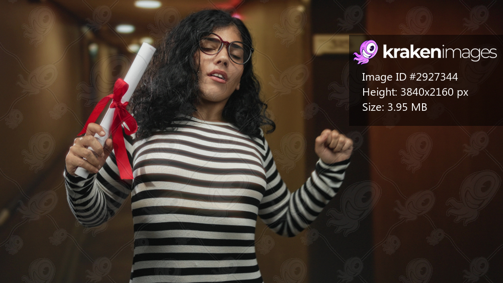 Woman holding diploma scroll tied with red ribbon in hotel corridor, wearing striped shirt and glasses, hand raised in celebratory gesture; pride.