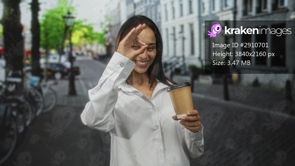 Woman holding disposable coffee cup on cobbled street making ok sign with smiling face; morning routine joy.