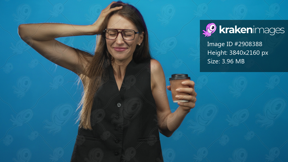 Woman holding disposable coffee cup and raising left hand to head with eyes closed and open mouth in blue studio wearing black vest; surprise.