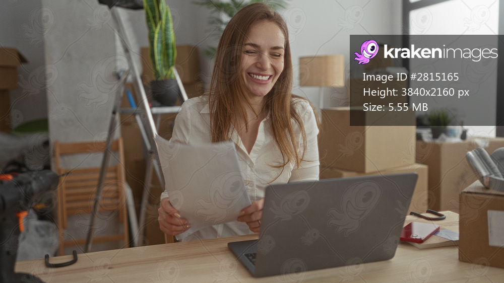 Woman holding document at desk with laptop clenches fist in building filled with moving boxes; achievement optimism resilience joy.
