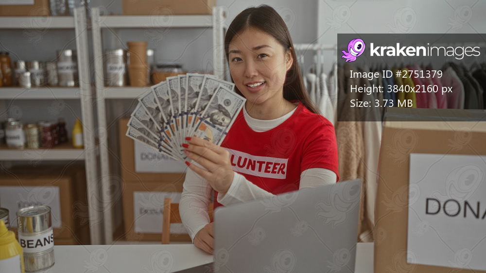 Woman holding dollar bills in charity room with donation boxes and clothing, highlighting her volunteer work in a center filled with shelves of essential items and storage containers. - Kraken Images