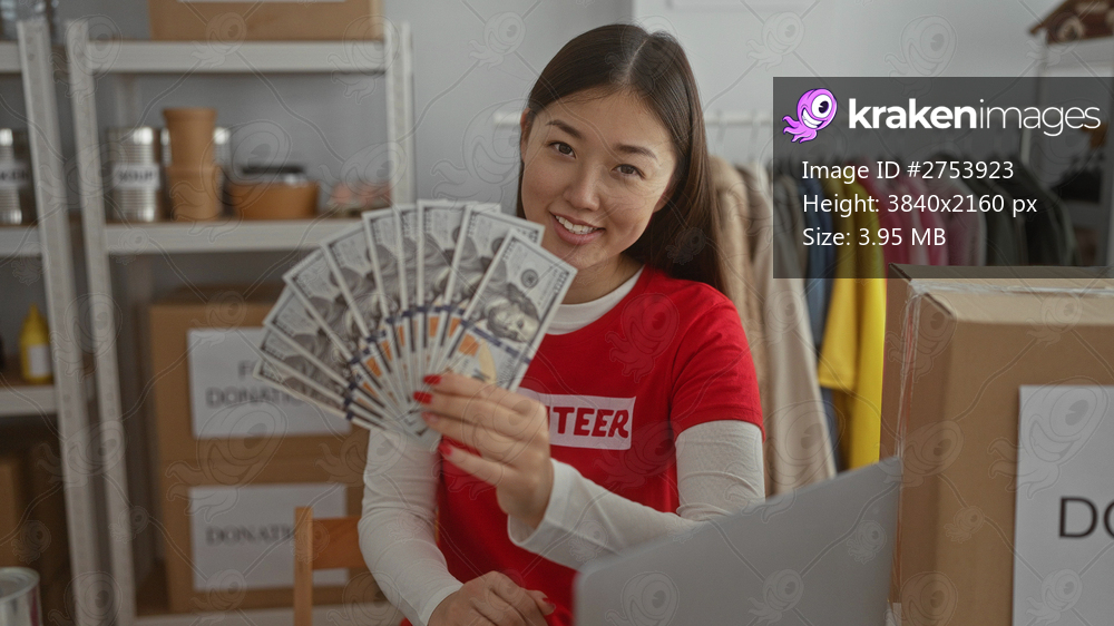 Woman holding dollar bills in charity room with donation boxes and clothing, highlighting her volunteer work in a center filled with shelves of essential items and storage containers. - Kraken Images
