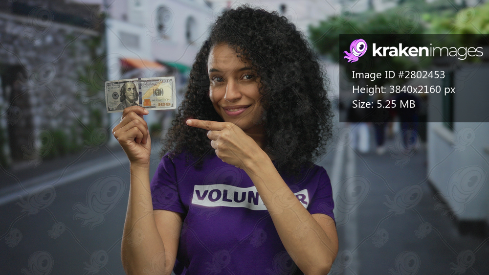Woman holding dollar in street wearing volunteer shirt smiling outdoor young latin hispanic female showing american money