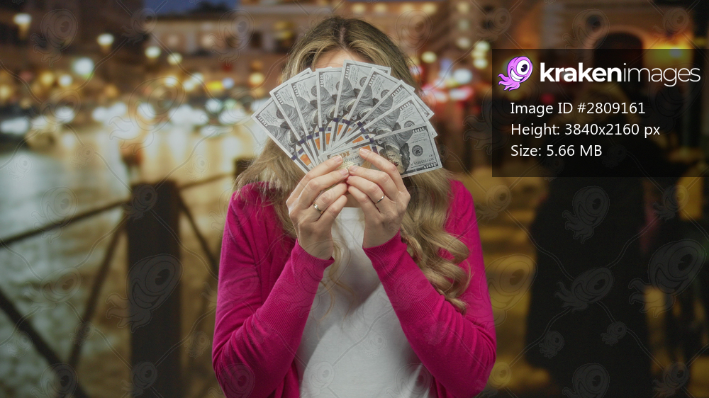 Woman holding dollars in a casual street at night, showcasing blonde hair and money outdoors with a vibrant city backdrop.