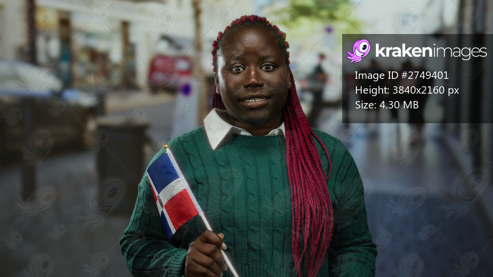Woman holding dominican republic flag outdoors in city street, expressing emotions in vibrant urban scene with diverse background showcasing cultural pride. - Kraken Images