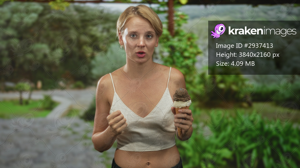 Woman holding double scoop ice cream cone points index finger toward camera on a forest path with serious, admonishing expression; warning restraint.