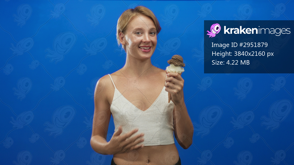 Woman holding double scoop ice cream cone, smiling and looking at the treat with bare navel visible in studio; playful joy.