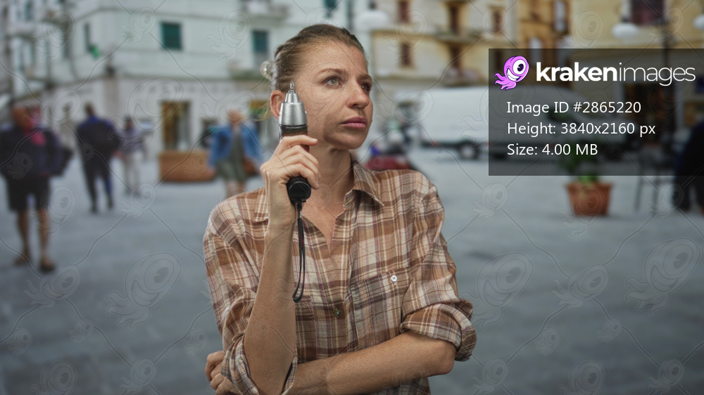 Woman holding drill with arm raised and other arm crossed on street, inspecting device while wearing plaid shirt; determination independence.