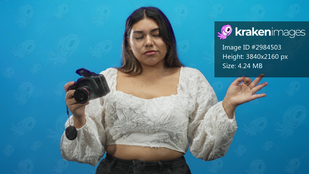 Woman holding dslr camera with eyes closed and relaxed hand gesture in blue studio with cropped white blouse visible; calm introspection.