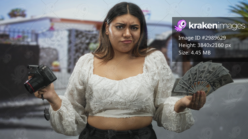 Woman holding dslr camera and fanning cash, midriff visible, poses on a street with palm tree; skepticism monetization.