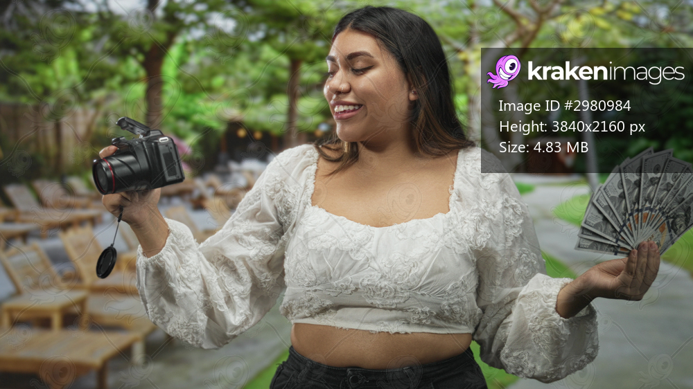 Woman holding dslr camera and fanning cash while showing midriff in forest; confidence monetization business.