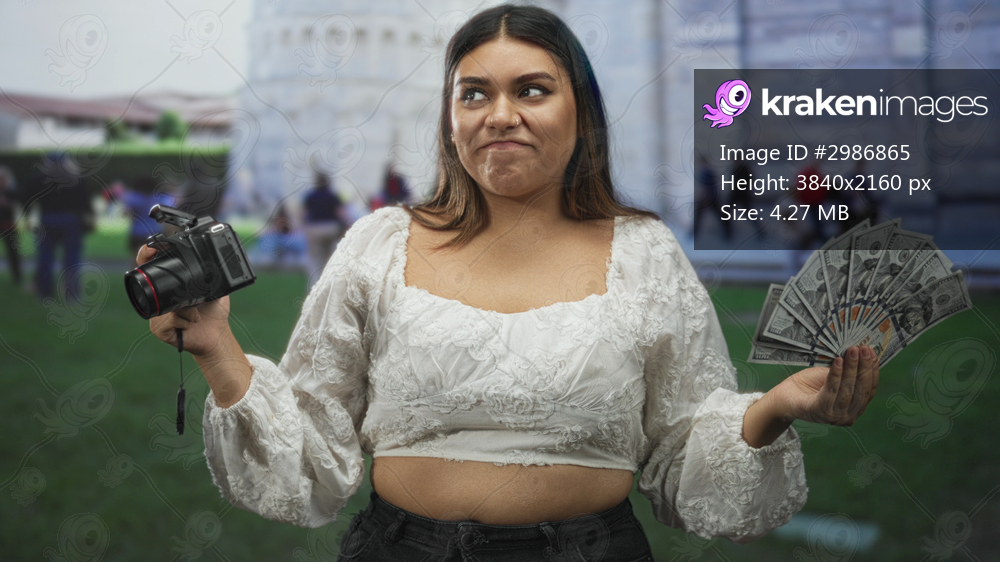 Woman holding dslr camera and fanning dollar bills, midriff in white top, mouth open, building lawn crowd; monetization confidence ambition.