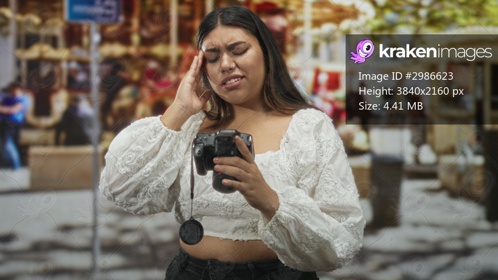 Woman holding dslr camera with hand to temple and pained expression, wearing white embroidered crop blouse in a busy street market; frustration creative block. - Kraken Images