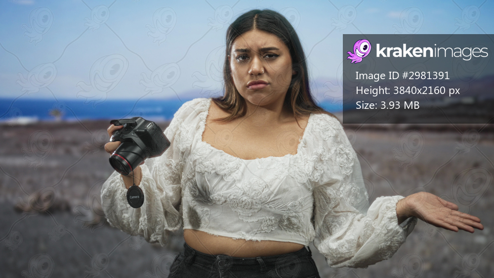 Woman holding dslr camera inspects settings and removes lens cap in studio; creative uncertainty frustration.