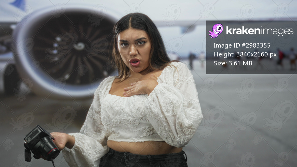 Woman holding dslr camera with lens cap dangling and hand on chest at airport tarmac near jet engine, looking puzzled and wary; surprise doubt.