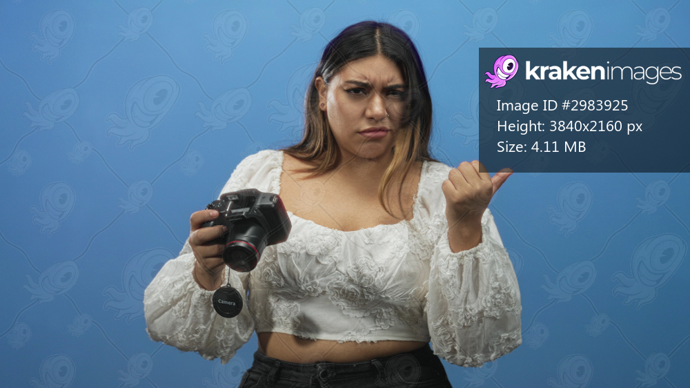 Woman holding dslr camera with lens cap dangling, thumb pointing and frowning in studio portrait setting; frustration doubt.