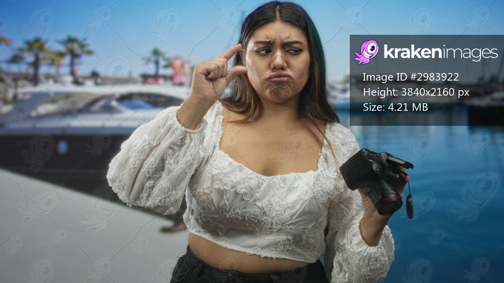 Woman holding dslr camera making pinching fingers gesture on street by marina with pout and shrug expression; frustration minor inconvenience.