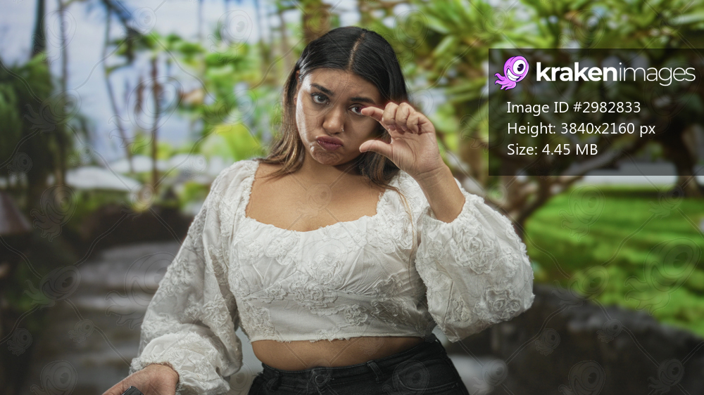 Woman holding dslr camera pinching fingers near eye in studio with tropical backdrop, pouting and gesturing small size; playful defiance.