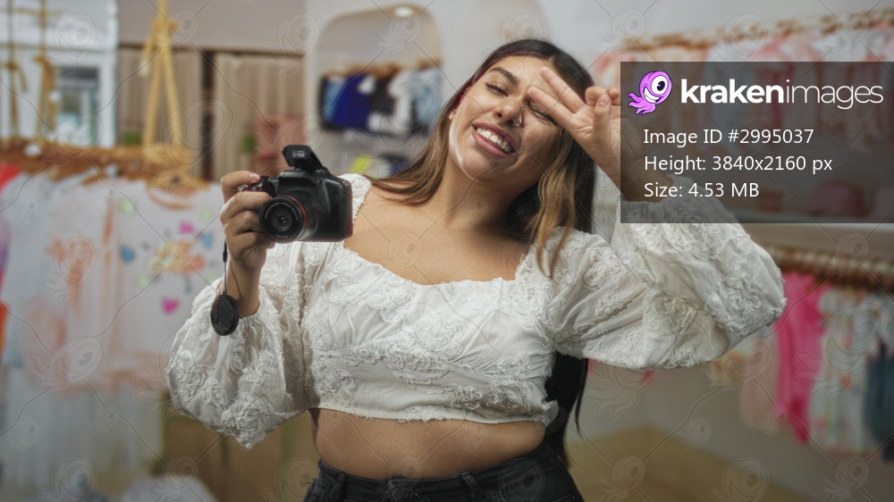 Woman holding dslr camera showing midriff while posing for mirror selfie in boutique store; confidence selfcare.