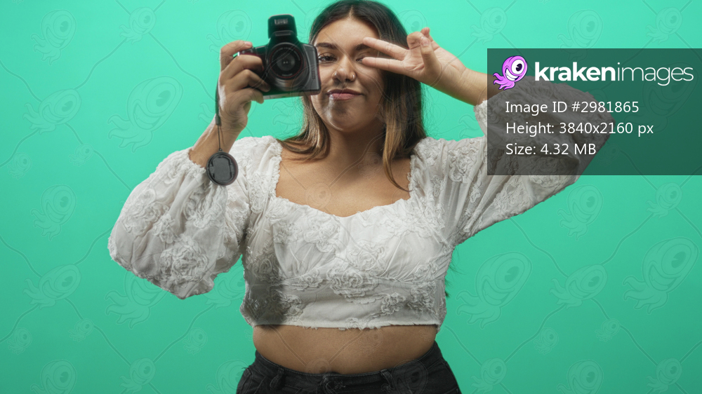 Woman holding dslr camera showing peace sign with bare stomach visible against green studio backdrop; playful confidence.