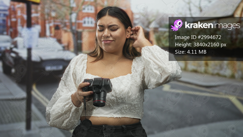 Woman holding dslr camera, squinting with hand to forehead on a residential street; frustration candid moment.