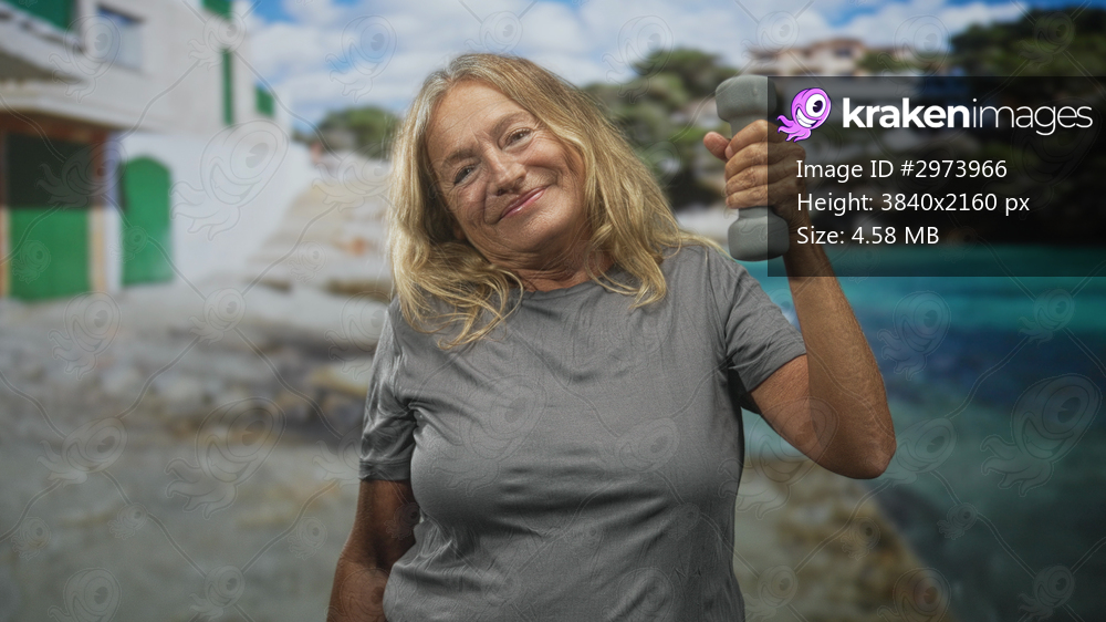 Woman holding dumbbell aloft with right arm and hand in front of a building by the seaside; resilience wellness.