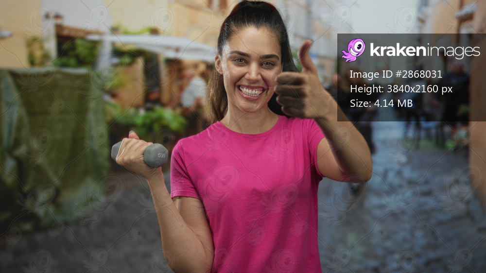 Woman holding dumbbell with bent elbow and giving thumbs up on cobblestone street; motivation health confidence.