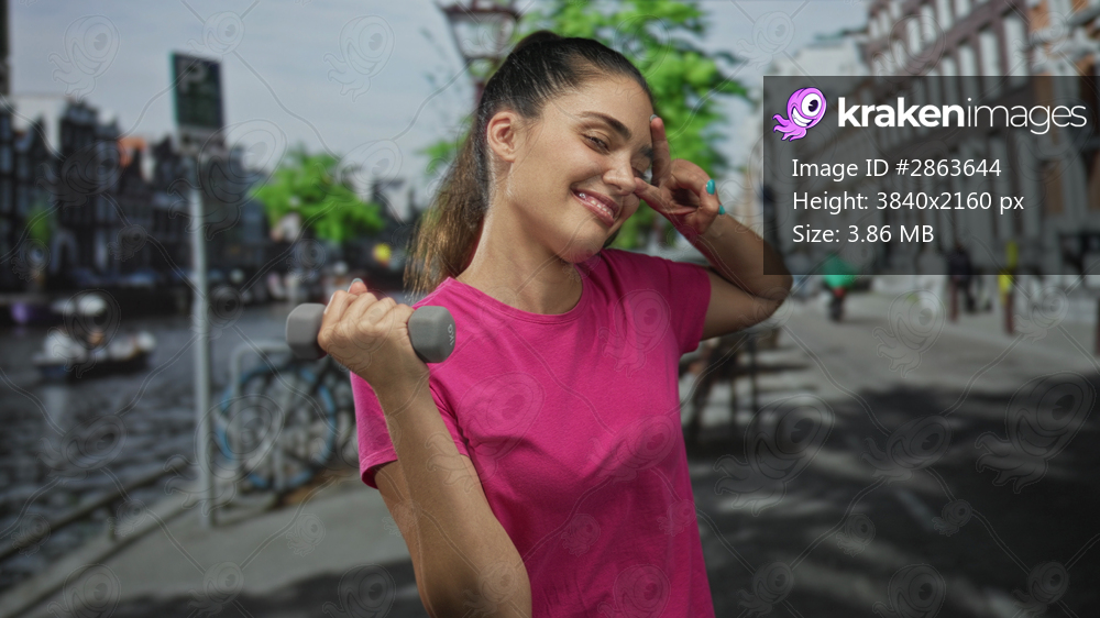 Woman holding dumbbell lifts weight and makes peace sign on street with canal view and parked bicycles; joy workout motivation.
