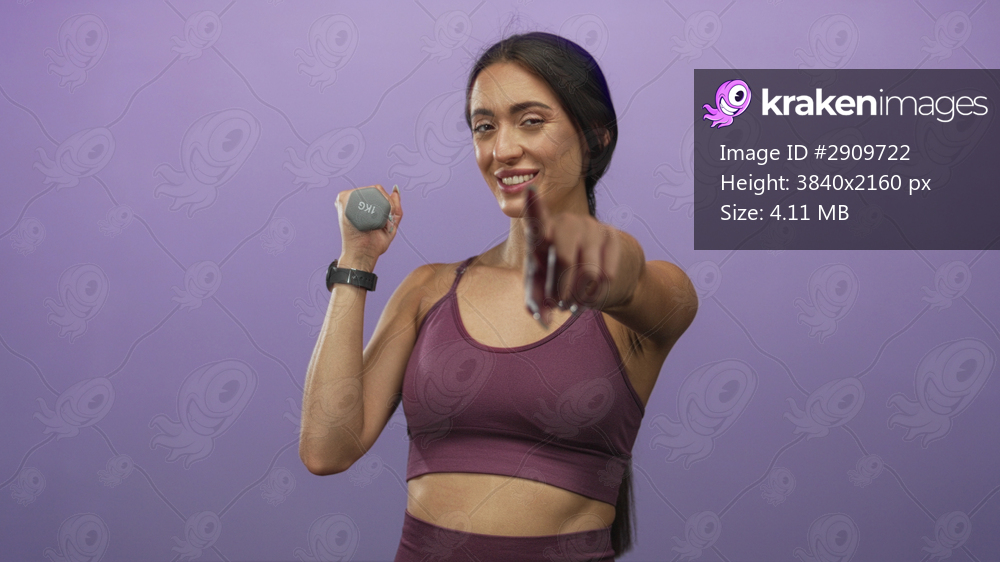 Woman holding dumbbell points finger to camera in purple studio wearing purple sports bra and fitness watch, midriff visible; confidence motivation.