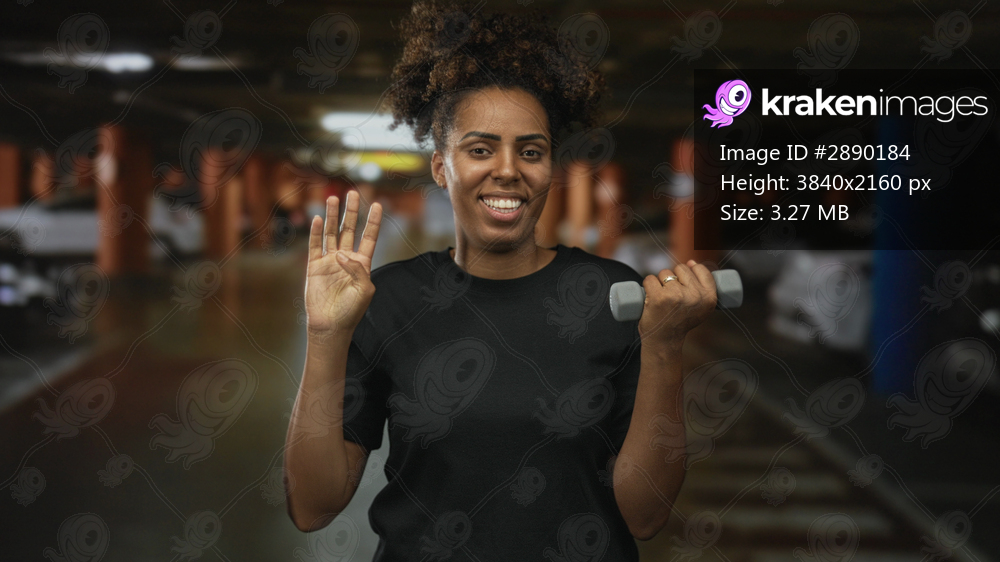 Woman holding dumbbell with right hand and showing four fingers with left hand in parking building while smiling and exercising; fitness progress confidence. - Kraken Images