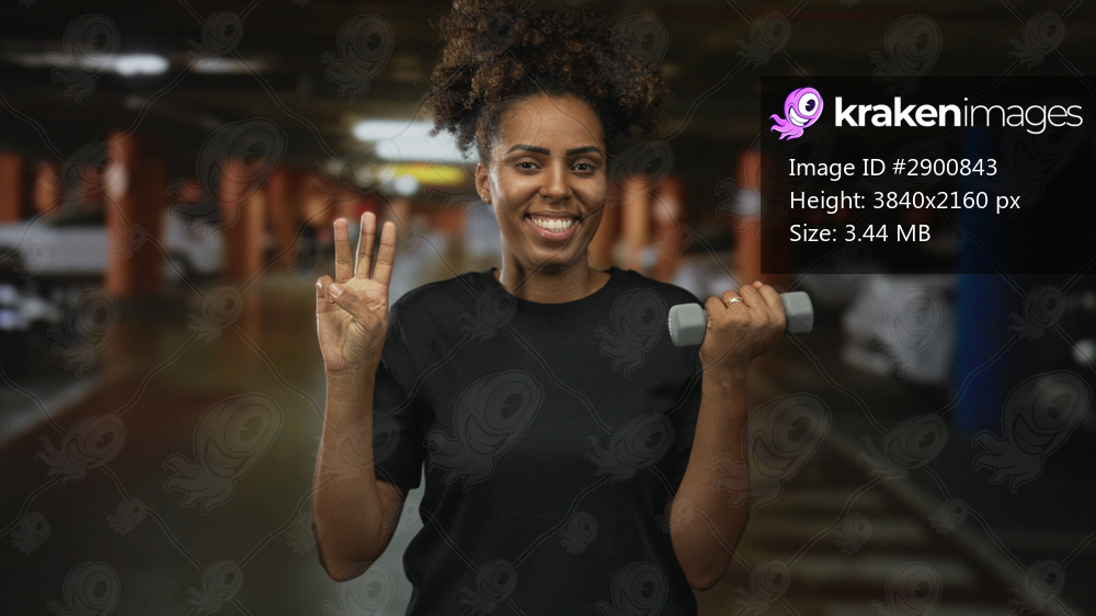 Woman holding dumbbell with right hand and showing four fingers with left hand in parking building while smiling and exercising; fitness progress confidence. - Kraken Images