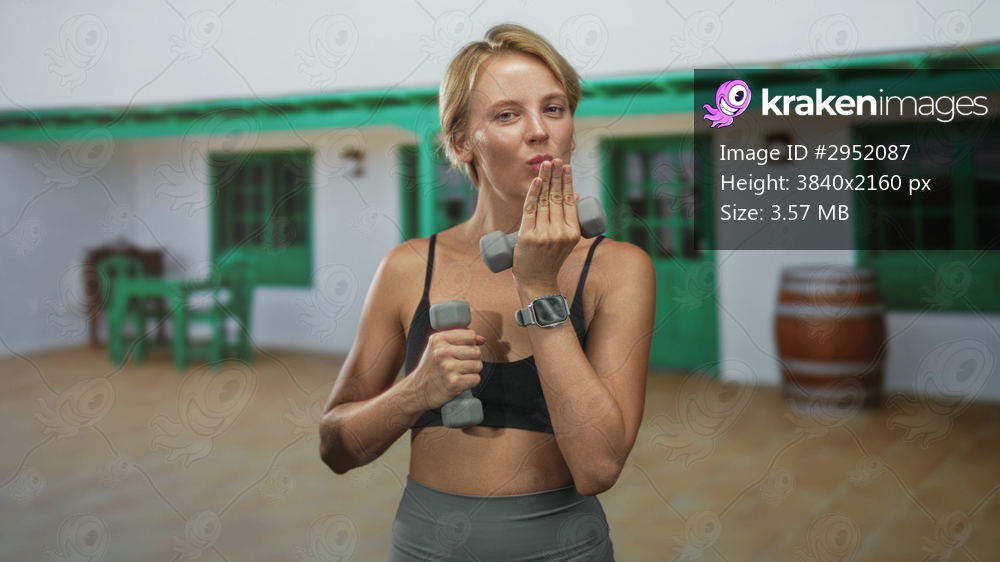 Woman holding dumbbells blows a kiss with hand over mouth wearing sports bra and smartwatch in a building patio; playful fitness motivation.