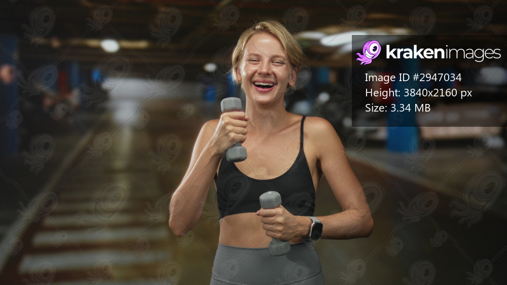Woman holding dumbbells, gripping one against her bare arm and abdomen while laughing in parking building; joy vitality.