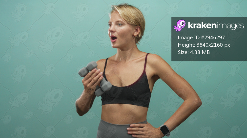 Woman holding dumbbells to chest in studio with sports bra and smartwatch, mid workout expression of effort; determination fitness.